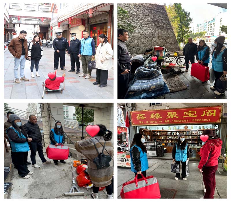 强化街面巡查,精准劝导救助。以街面流浪乞讨人员救助服务工作为重点,全面加强巡查与劝导力度,通过深入主次干道、桥梁涵洞、景区周边、车站广场等流浪乞讨人员易出没区域,做到全方位排查、全覆盖救助。工作人员随身携带开水、热食及保温物资,同步备好包含厚外套、保暖内衣、保温杯、急救用品、食品、暖宝宝、防护用品在内的春节爱心大礼包,第一时间为流浪乞讨人员送上热食热水,耐心劝导返乡与家人团聚或入站接受集中救助。对于不愿入站接受救助的对象,及时送上春节爱心大礼包,告知救助热线,并做好后续跟踪关注。同时,积极联动街道、社区等多方力量,压实属地责任,协同做好流浪乞讨人员的巡查走访、宣传劝导工作。
